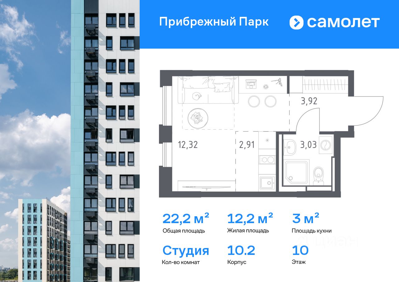 Предлагается квартира студия комфорт-класса 22,18 кв.м в корпусе 10.2 на 10 этаже, в ЖК "Прибрежный Парк"
