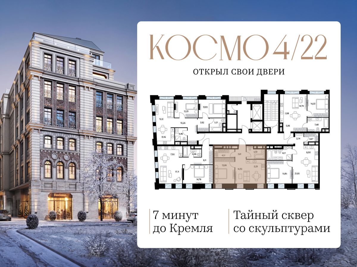 "Космо 4/22" находится всего в 7 минутах от Кремля с быстрым выездом на Садовое кольцо.