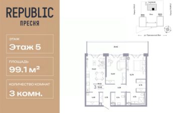 Продается 3комнатная квартира на 5 этаже от застройщика Страна Девелопмент. Площадь квартиры 99,1 кв. м. Стоимость указана без учета акций.
