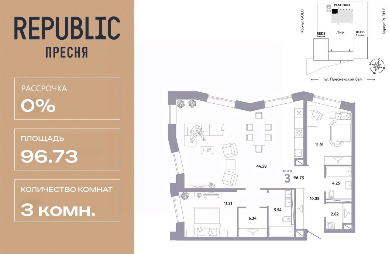 Продается 3комнатная квартира на 8 этаже от застройщика Страна Девелопмент. Площадь квартиры 96,73 кв. м.