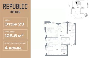 Продается 4комнатная квартира на 23 этаже от застройщика Страна Девелопмент. Площадь квартиры 128,6 кв. м. Стоимость указана без учета акций.
