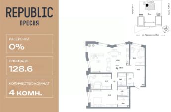 Продается 4комнатная квартира на 23 этаже от застройщика Страна Девелопмент. Площадь квартиры 128,6 кв. м.