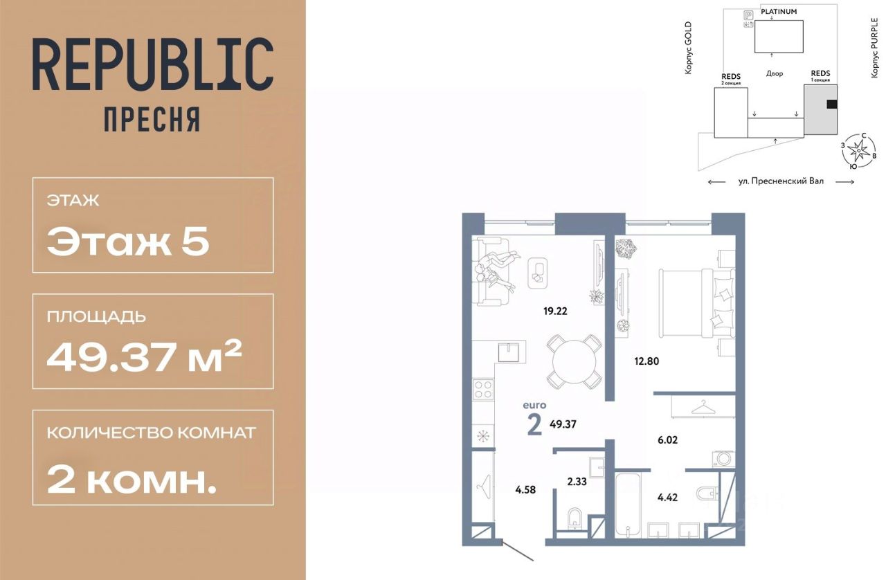 Продается 2комнатная квартира на 5 этаже от застройщика Страна Девелопмент. Площадь квартиры 49,37 кв. м. Стоимость указана без учета акций.