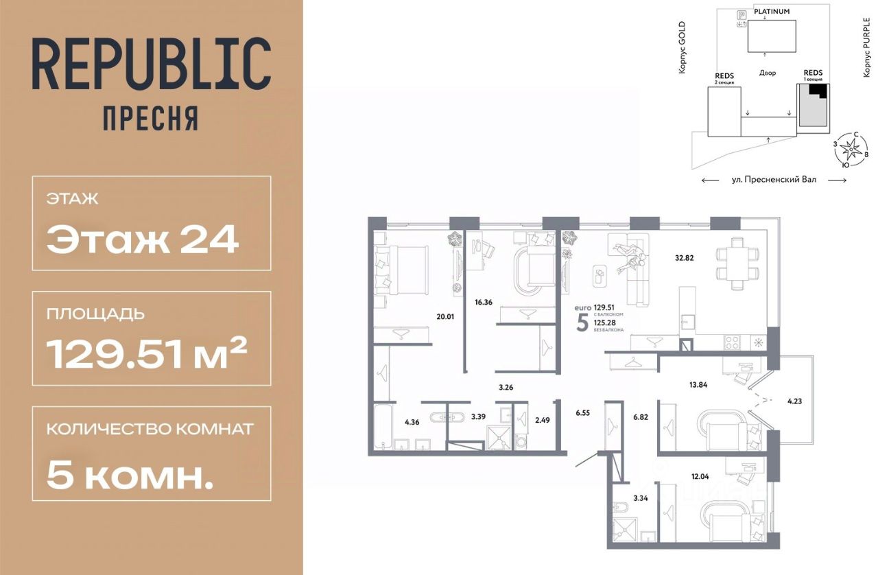 Продается 5комнатная квартира на 24 этаже от застройщика Страна Девелопмент. Площадь квартиры 129,51 кв. м. Стоимость указана без учета акций.