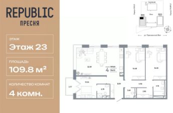 Продается 4комнатная квартира на 23 этаже от застройщика Страна Девелопмент. Площадь квартиры 109,8 кв. м. Стоимость указана без учета акций.