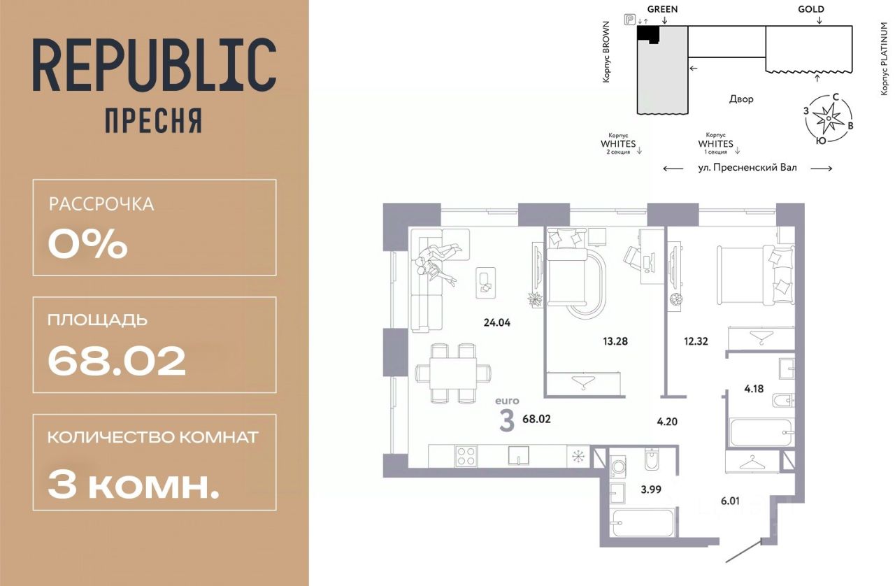 Продается 3комнатная квартира на 3 этаже от застройщика Страна Девелопмент. Площадь квартиры 68,02 кв. м.