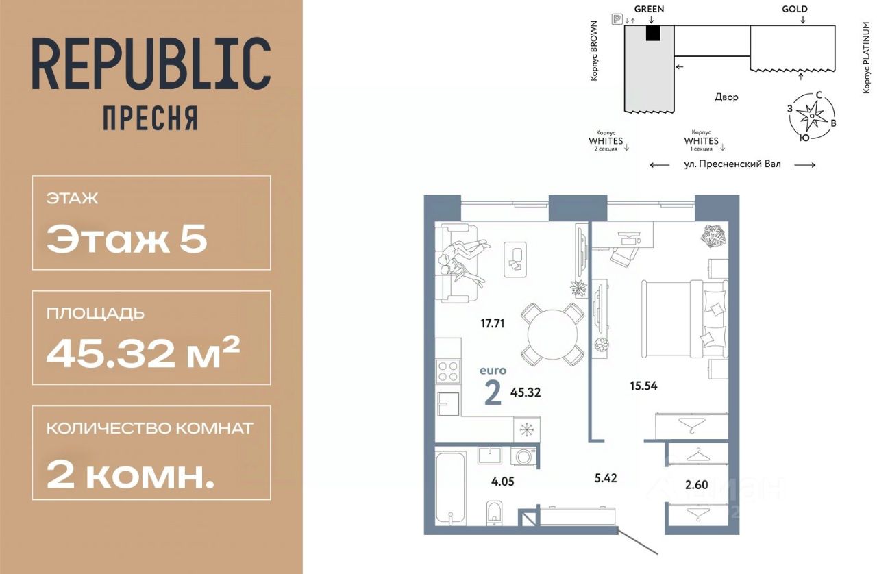 Продается 2комнатная квартира на 5 этаже от застройщика Страна Девелопмент. Площадь квартиры 45,32 кв. м. Стоимость указана без учета акций.