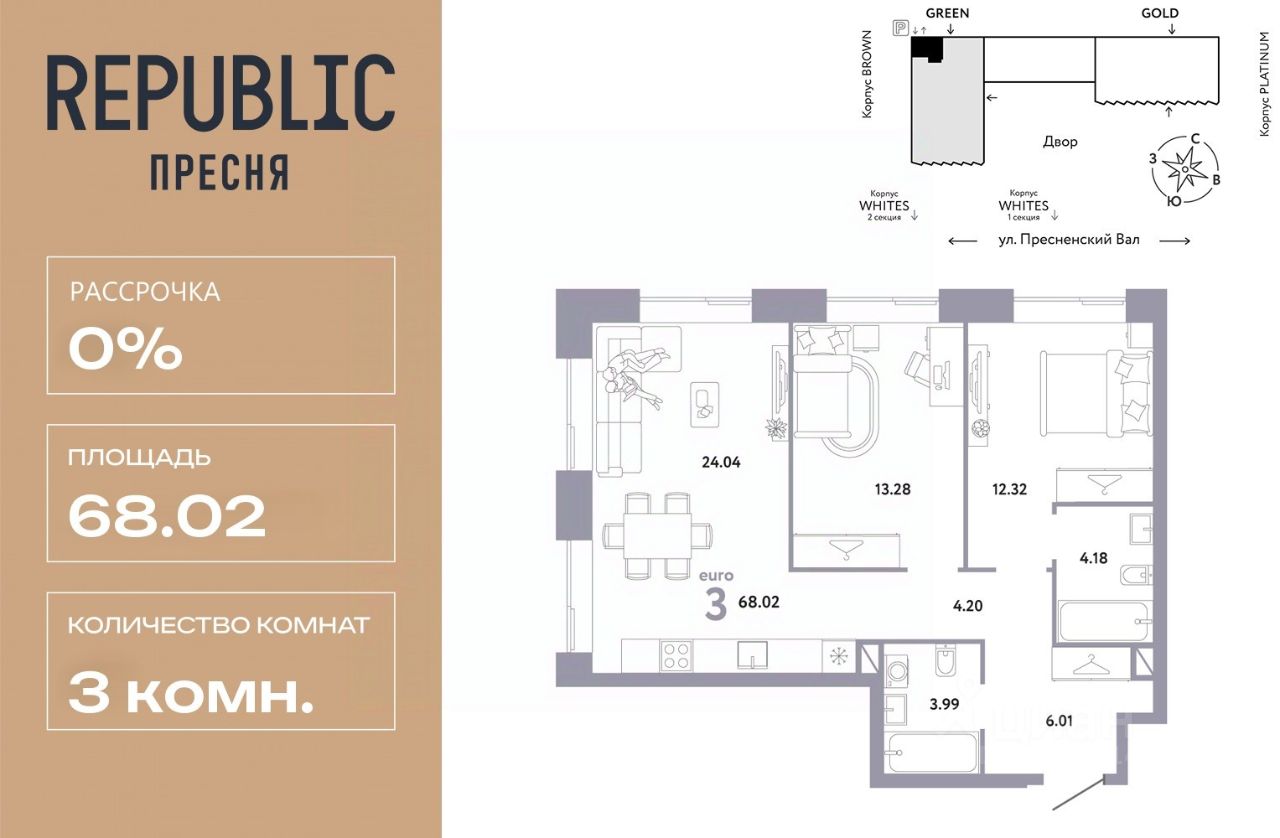 Продается 3комнатная квартира на 16 этаже от застройщика Страна Девелопмент. Площадь квартиры 68,02 кв. м.