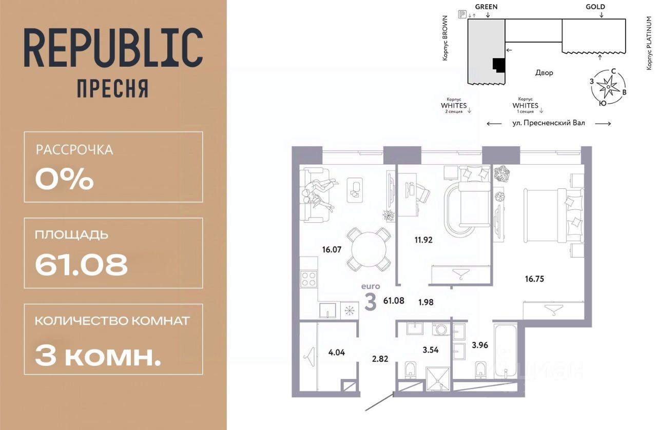 Продается 3комнатная квартира на 19 этаже от застройщика Страна Девелопмент. Площадь квартиры 61,08 кв. м.