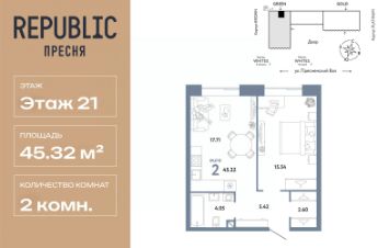 Продается 2комнатная квартира на 21 этаже от застройщика Страна Девелопмент. Площадь квартиры 45,32 кв. м. Стоимость указана без учета акций.