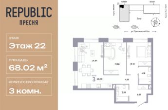 Продается 3комнатная квартира на 22 этаже от застройщика Страна Девелопмент. Площадь квартиры 68,02 кв. м. Стоимость указана без учета акций.