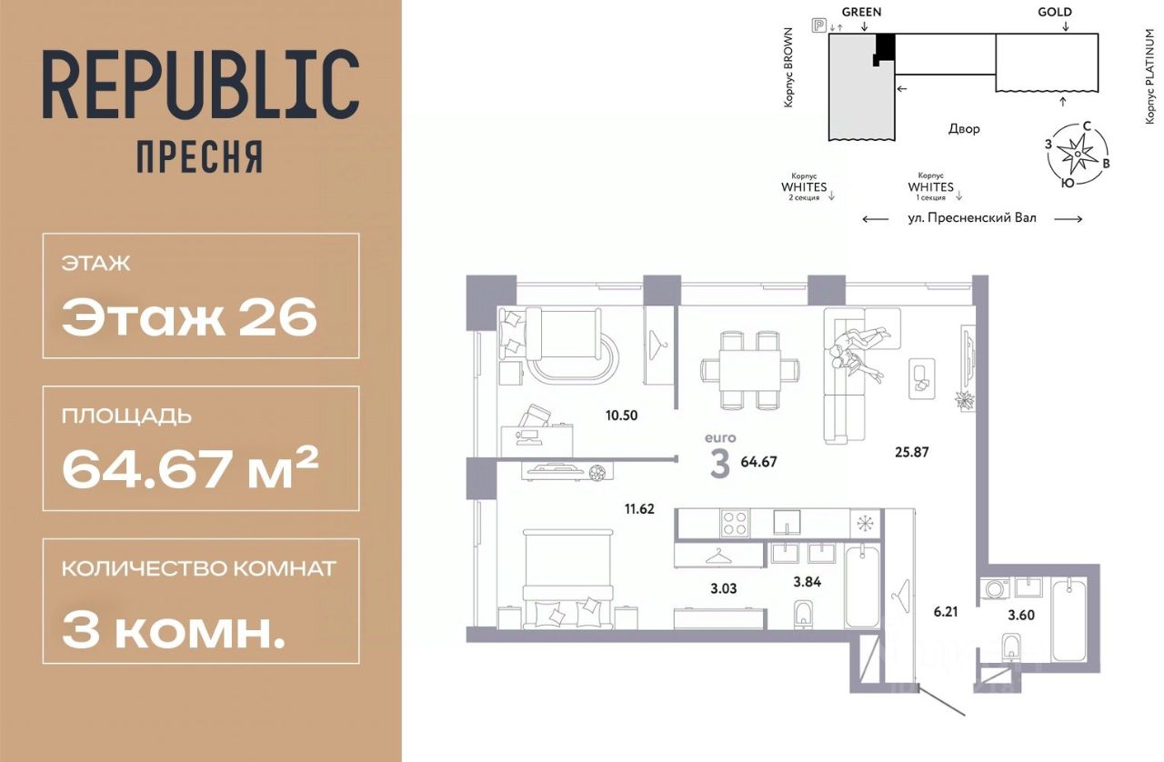 Продается 3комнатная квартира на 26 этаже от застройщика Страна Девелопмент. Площадь квартиры 64,67 кв. м. Стоимость указана без учета акций.
