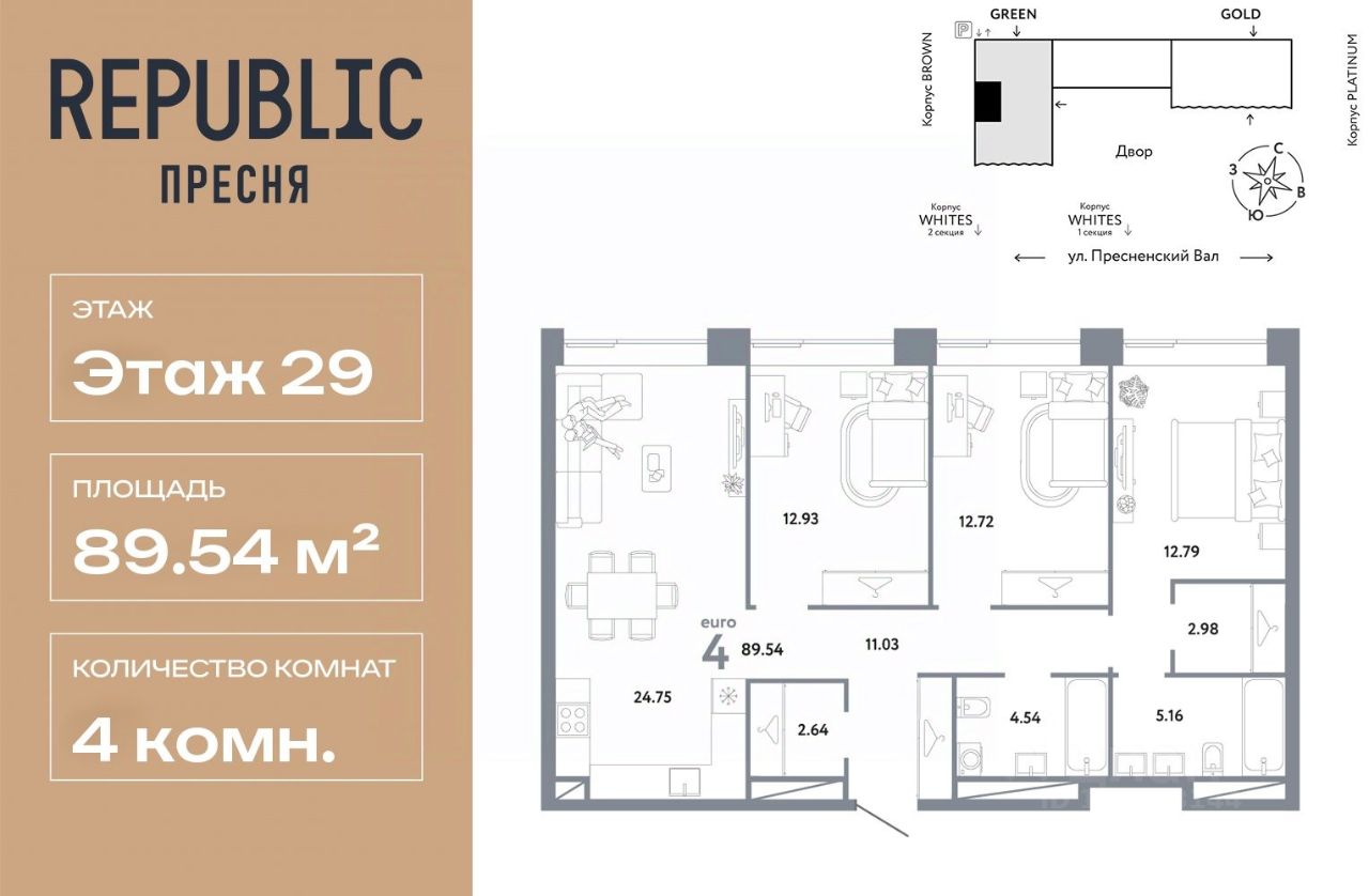 Продается 4комнатная квартира на 29 этаже от застройщика Страна Девелопмент. Площадь квартиры 89,54 кв. м. Стоимость указана без учета акций.