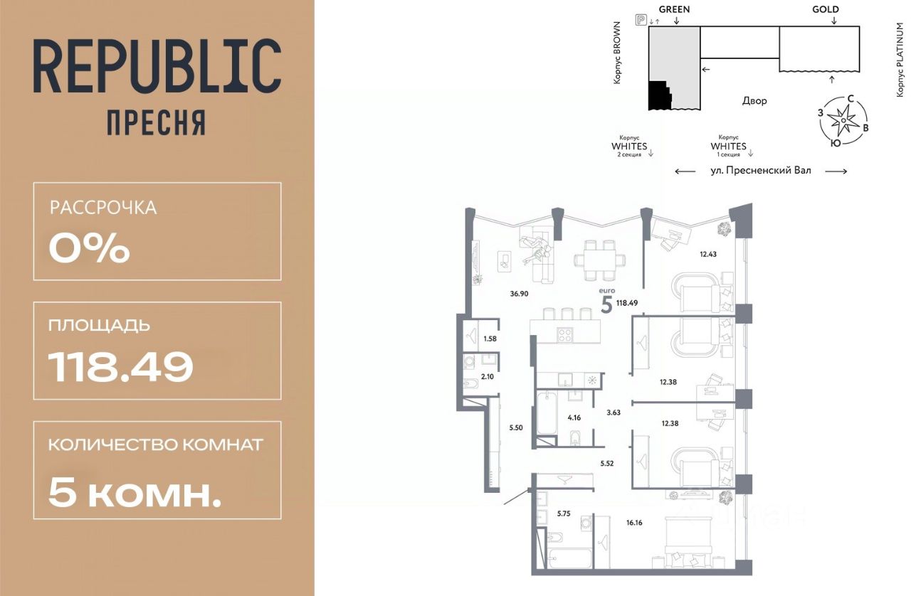 Продается 5комнатная квартира на 32 этаже от застройщика Страна Девелопмент. Площадь квартиры 118,49 кв. м.