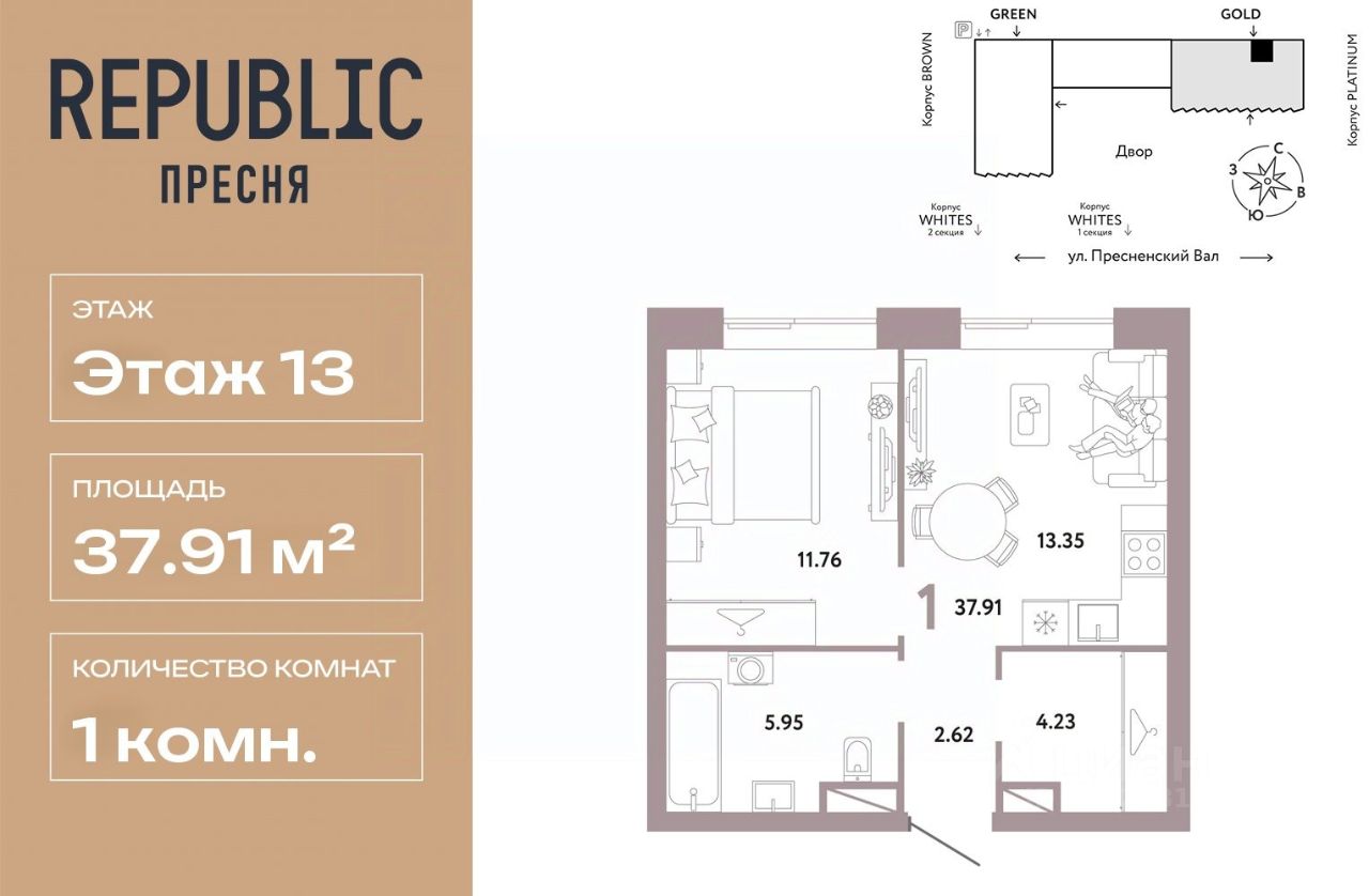 Продается 1комнатная квартира на 13 этаже от застройщика Страна Девелопмент. Площадь квартиры 37,91 кв. м. Стоимость указана без учета акций.