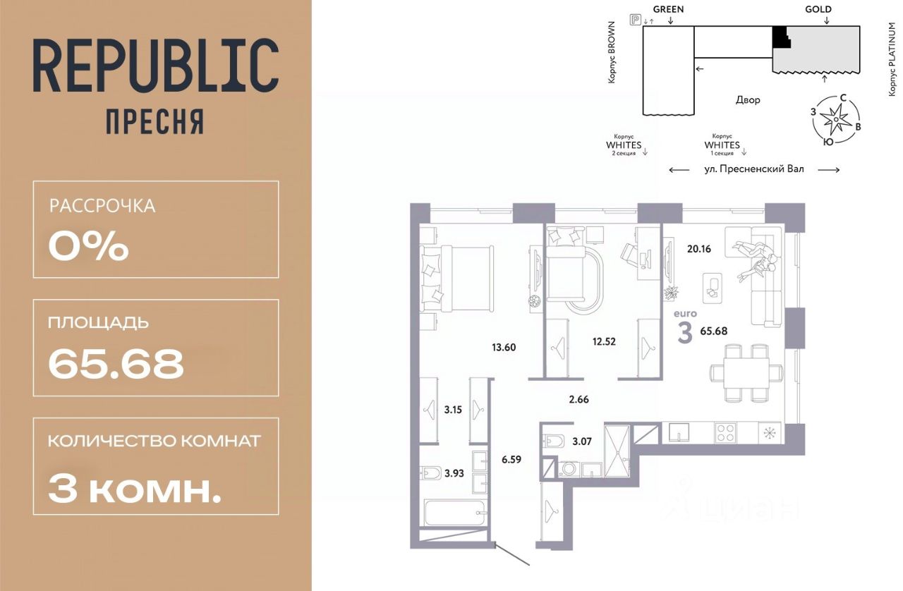 Продается 3комнатная квартира на 19 этаже от застройщика Страна Девелопмент. Площадь квартиры 65,68 кв. м.