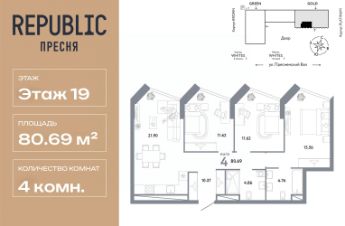 Продается 4комнатная квартира на 19 этаже от застройщика Страна Девелопмент. Площадь квартиры 80,69 кв. м. Стоимость указана без учета акций.