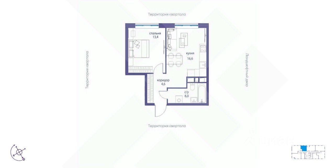 Продаётся 1-комнатная квартира бизнес-класса в жилом квартале "Остров 5" корпус 3 (секция 1). общей площадью 40.40 кв. м. В квартире высокие потолки и низкий подоконник (60 см от пола).