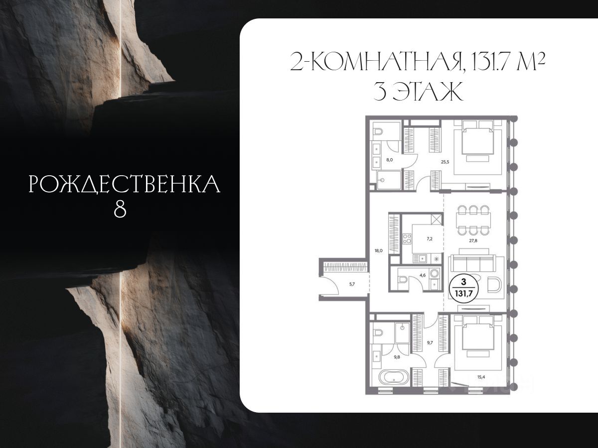 В продаже 2 комнатная квартира площадью 131.70 кв. м, расположенная на 3 этаже 7 этажного дома. Квартира находится в 1 корпусе жилых домов делюкс-класса "Рождественка 8".