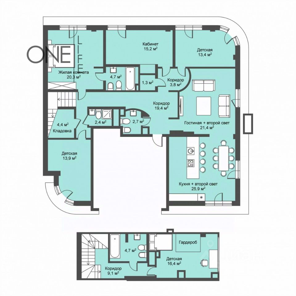 1 этаж: кухня-гостиная со вторым светом, мастер спальня со своим сан. узлом, 2 детских, кладовая, 2 сан. узла, кабинет.