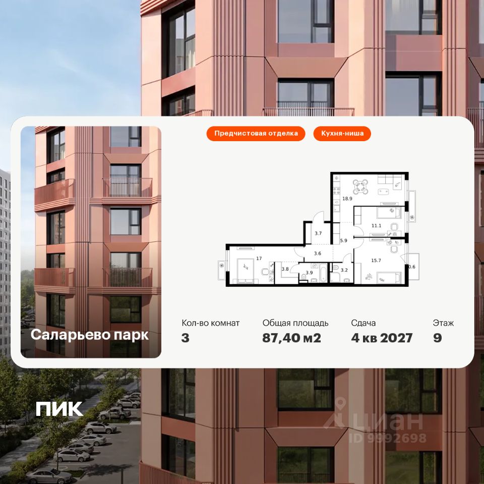 Продаётся 3-комн. квартира площадью 87,4 кв.м на 9 этаже 15 этажного дома (Корпус 57.2, Секция 2) проекта ПИК Саларьево парк. Светлый просторный подъезд на уровне земли, функциональная планировка, большие окна, предчистовая отделка.