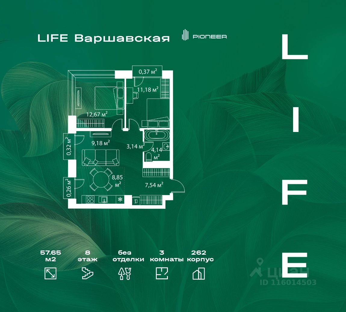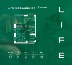 В районе Москворечье-Сабурово продается 3-комнатная квартира площадью 57.65 м². Она расположена на 8 этаже в 262 корпусе нового жилого квартала LIFE Варшавская.