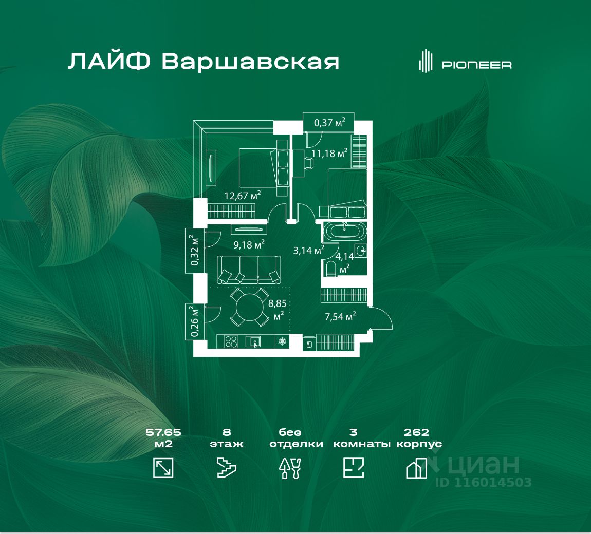 В районе Москворечье-Сабурово продается 3-комнатная квартира площадью 57.65 м². Она расположена на 8 этаже в 262 корпусе нового жилого квартала Лайф Варшавская.