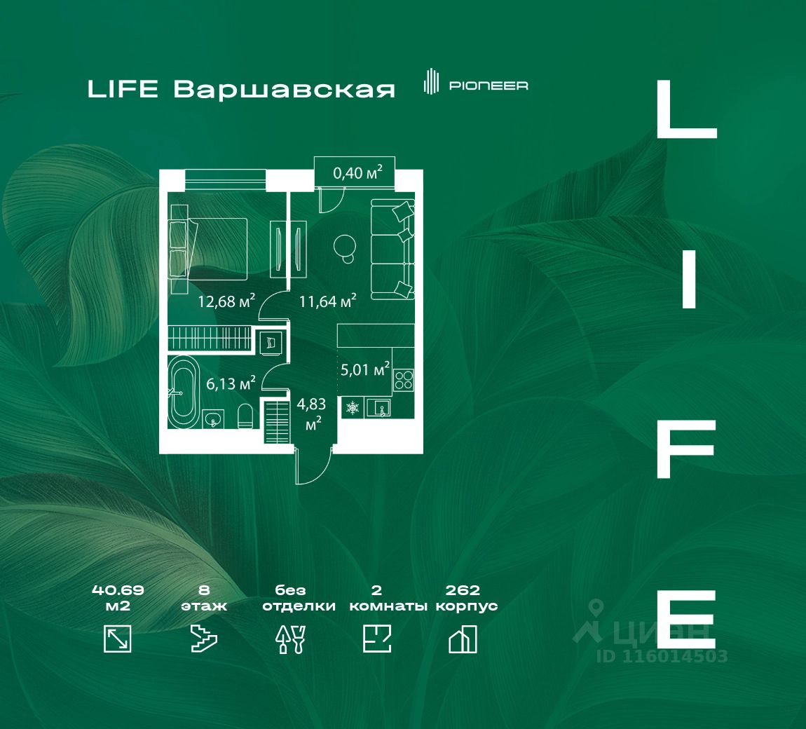 В районе Москворечье-Сабурово продается 2-комнатная квартира площадью 40.69 м². Она расположена на 8 этаже в 262 корпусе нового жилого квартала LIFE Варшавская.