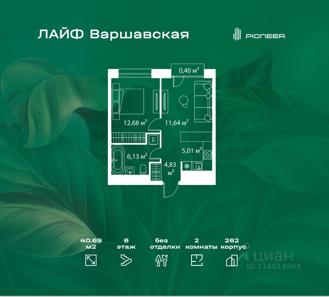 В районе Москворечье-Сабурово продается 2-комнатная квартира площадью 40.69 м². Она расположена на 8 этаже в 262 корпусе нового жилого квартала Лайф Варшавская.