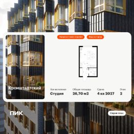 Продаётся квартира-студия площадью 26,7 кв.м на 2 этаже 12 этажного дома (Корпус 1.1.1, Секция 1) проекта ПИК Кронштадтский 9. Светлый просторный подъезд на уровне земли, функциональная планировка, большие окна, предчистовая отделка.