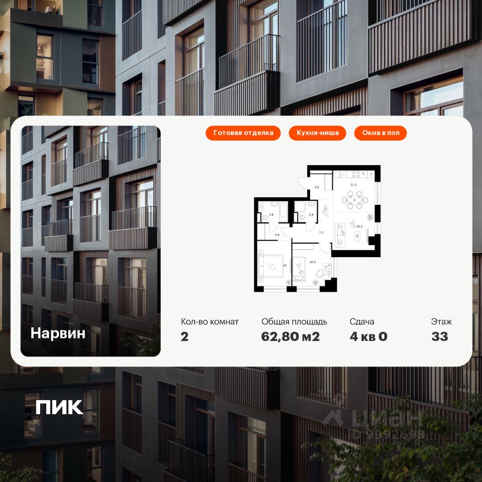 Новостройка! Продается 2-комн. кв-ра площадью 62,8 кв.м, (Корпус 1.3, Секция 3) 33 этаж 38-этажного дома в Нарвин от ПИК. Новый проект ПИК Серии плюс "Нарвин" возводится в Головинском районе Москвы.