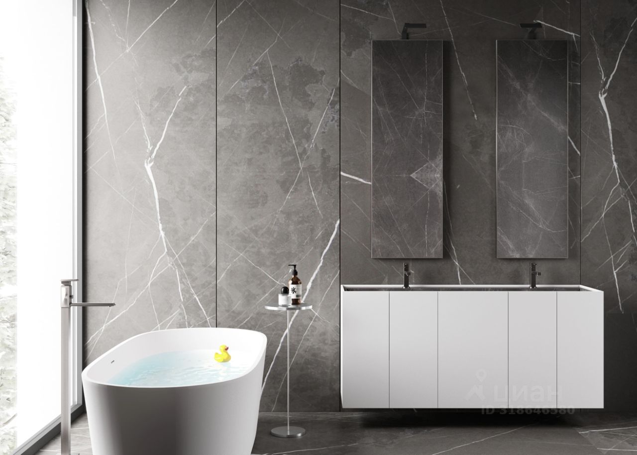 Отделка осуществляется с применением натуральных материалов: мрамора и ценных пород дерева. Подобраны элегантные детали интерьера и мягкая мебель. На кухне встроена бытовая техника Miele и кухонные модули Rossana. Стены и пол ванных комнат выложены мрамором Pietra Grey, установлен санфаянс Villeroy&Boch и Gessi.
