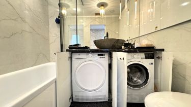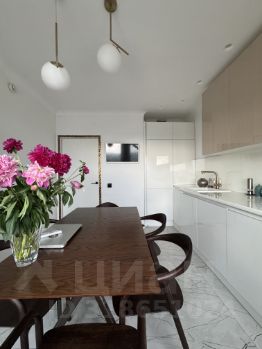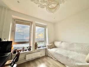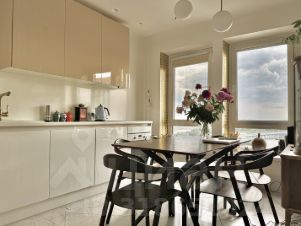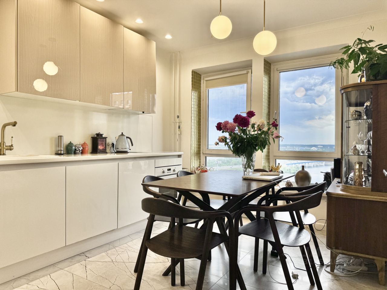 Изолированные комнаты (14-12-11), окна на две стороны с панорамным видом на реку, потолки 2.70, полы - ламинат, плитка, стены - облицовка керамогранитом и обои под покраску, полтора санузла, кухонный гарнитур со встроенной техникой, стиральная и сушильная машины в ванной. Балкона нет.