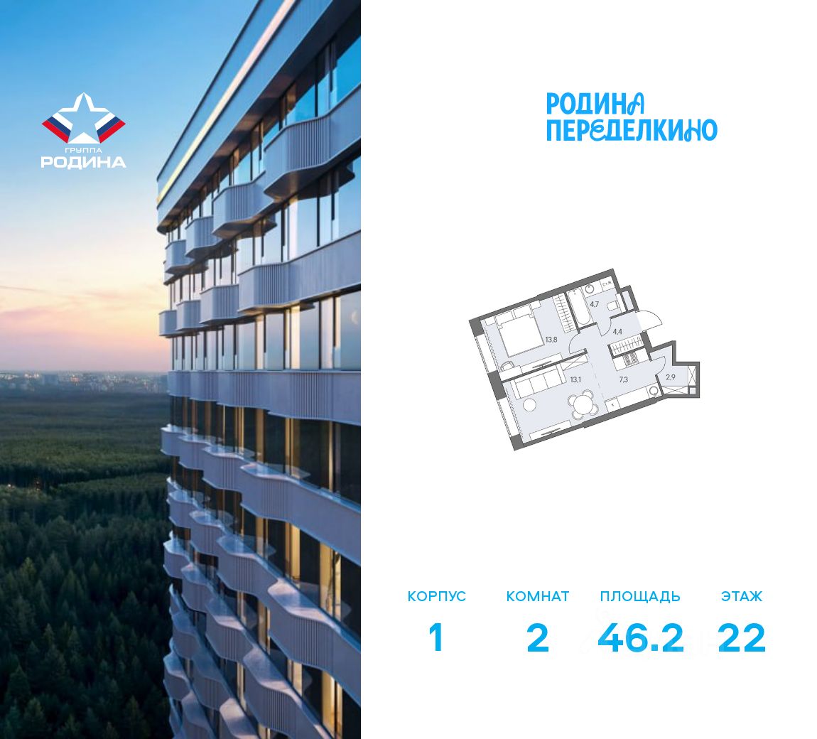 Продаётся 2-комнатная квартира площадью 46.2 м² на 22 этаже в Жилом Комплексе "Родина Переделкино".