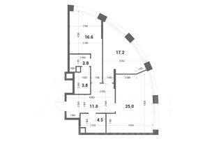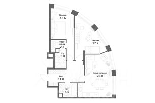 Планировка позволяет организовать: просторную продольную кухню-гостиную (25 м²) с двумя окнами; мастер-спальню (16,6 м²) с собственным санузлом и большой гардеробной; дополнительную спальню или детскую (17,2 м²) с двумя окнами; основной санузел; просторный холл с возможностью организации дополнительных мест для хранения.