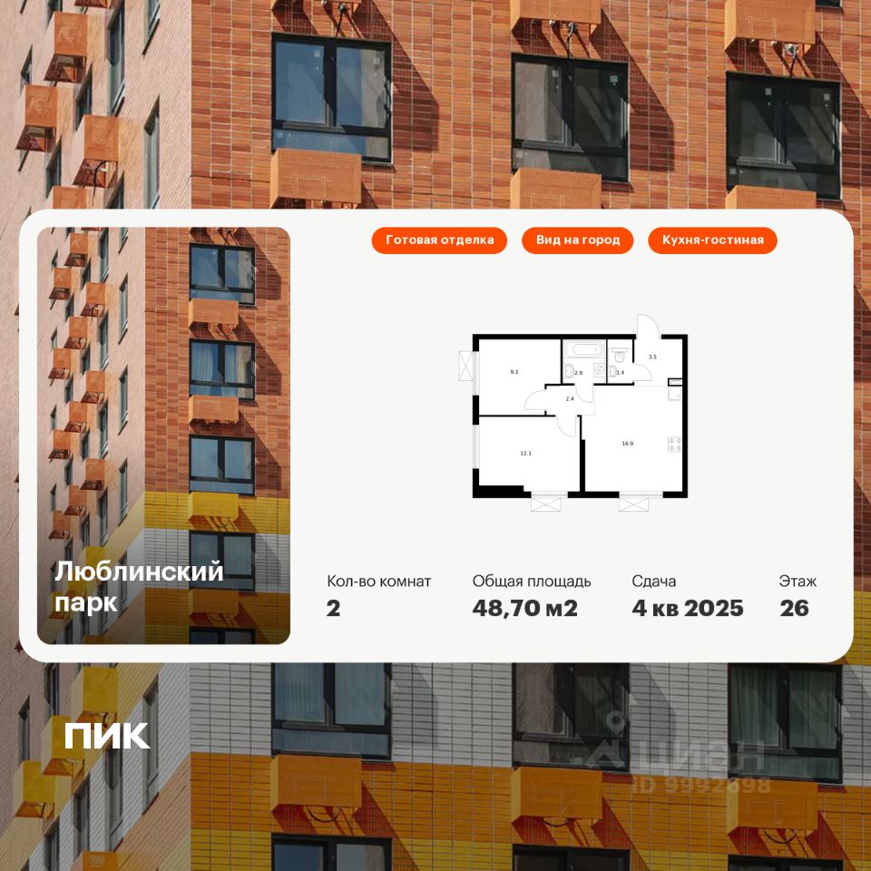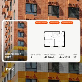 Продаётся 2-комн. квартира площадью 48,7 кв.м на 26 этаже 33 этажного дома (Корпус 14.1, Секция 1) проекта ПИК Люблинский парк. Светлый просторный подъезд на уровне земли, функциональная планировка, большие окна, c отделкой.