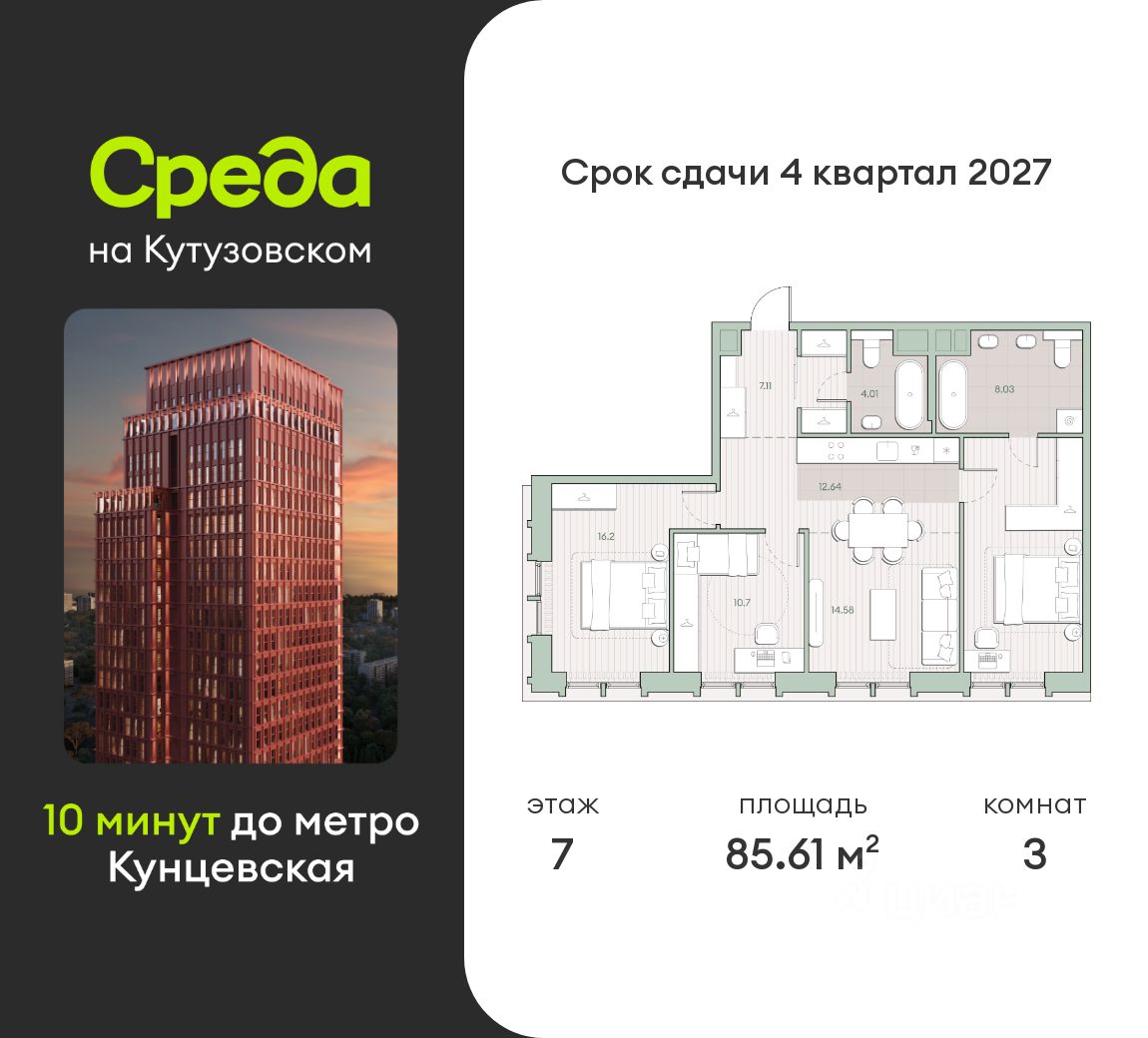 Продаётся 3-комнатная квартира общей площадью 85.61 кв.м. без отделки. Квартира расположена на 7 этаже корпуса 4.2 в жилом комплексе бизнес-класса "Среда на Кутузовском" в пешей доступности от метро "Кунцевская".