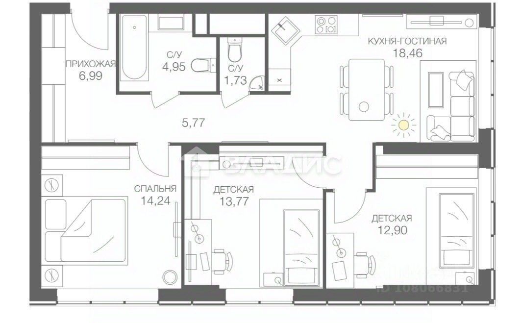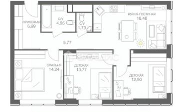 - кухня-гостиная 18,5 м² - светлое сердце квартиры. Большое общее пространство с естественным светом, зоной отдыха и полноценной столовой. Отлично для семьи и приёма гостей.