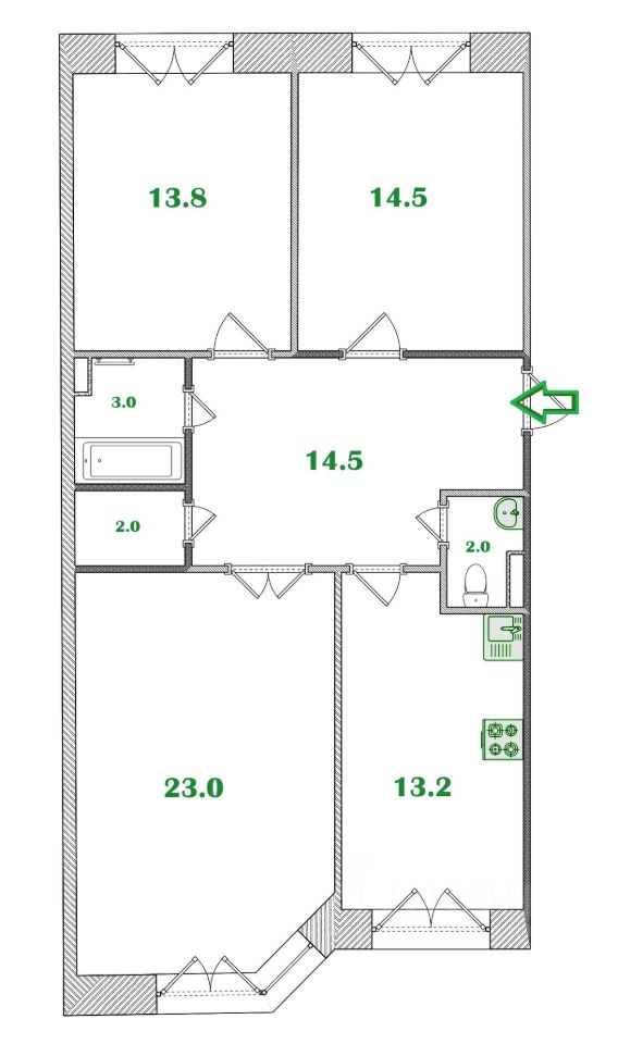 Потолки 3 метра, изолированные комнаты, большой холл, кладовка, окна на две стороны.