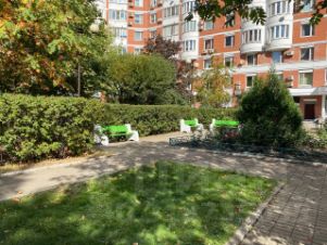 Двор-парк с детскими площадками для разных возрастов, футбольная коробка.