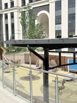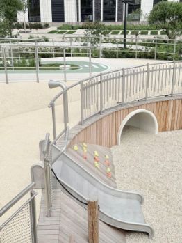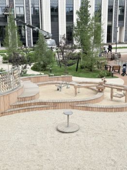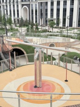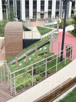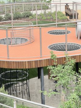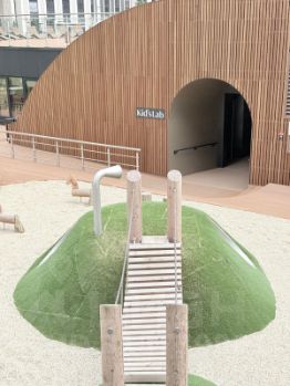 • Встроенная в холмы развивающая площадка 910 кв. м выполнена в форме каньона. На каждом из уровней ребят ждут захватывающие приключения — пространство растёт вверх и развивается вместе с детьми.