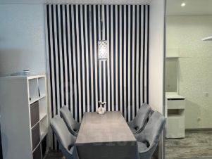 Свежий ремонт - обновляли в прошлом году. В спальне и коридоре обои, на кухне - венецианская штукатурка, в обеденной зоне - окрашенная стена и рейки.