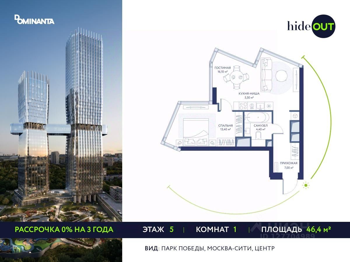 Продается 1-комнатная квартира площадью 46,4 кв.м. на 5-м этаже 34-этажного дома в ЖК hideOUT с панорамными видами: Парк Победы, Москва-Сити, Центр. Высота потолков 3,25 м.