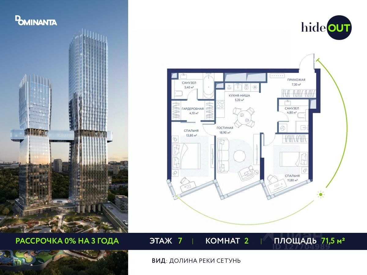 Продается 2-комнатная квартира площадью 71,5 кв.м. на 7-м этаже 34-этажного дома в ЖК hideOUT с панорамными видами: Долина реки Сетунь.