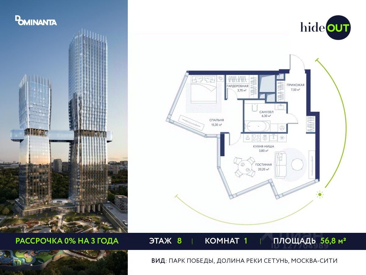 Продается 1-комнатная квартира площадью 56,8 кв.м. на 8-м этаже 34-этажного дома в ЖК hideOUT с панорамными видами: Парк Победы, Долина реки Сетунь, Москва-Сити. Высота потолков 3,25 м.