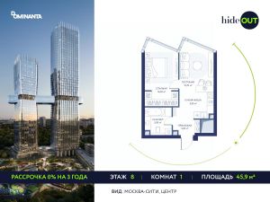 Продается 1-комнатная квартира площадью 45,9 кв.м. на 8-м этаже 34-этажного дома в ЖК hideOUT с панорамными видами: Москва-Сити, Центр.
