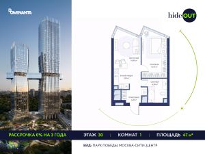 Продается 1-комнатная квартира площадью 47 кв.м. на 30-м этаже 34-этажного дома в ЖК hideOUT с панорамными видами: Парк Победы, Москва-Сити, Центр.
