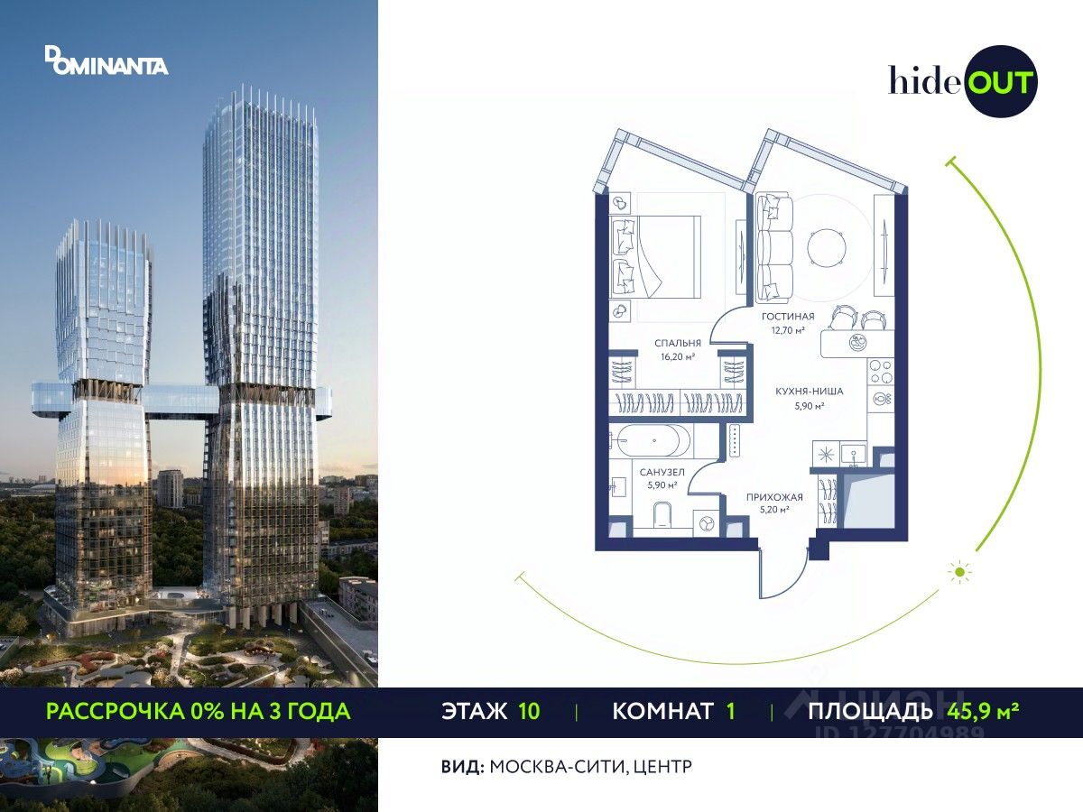 Продается 1-комнатная квартира площадью 45,9 кв.м. на 10-м этаже 34-этажного дома в ЖК hideOUT с панорамными видами: Москва-Сити, Центр.
