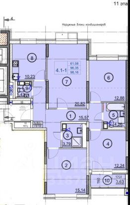 Располагается на видовом 11 этаже, имеет общую площадь 98.16 кв м и комфортные параметры: