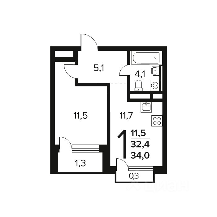 Общая площадь: 34.0 кв.м., жилая: 11.5 кв.м., площадь кухни: 11.7 кв.м. Этаж: 11.